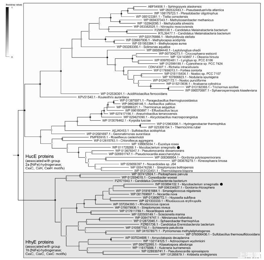 圖1、與2a組和1h[NiFe]-氫化酶相關的HucE和HhyE蛋白的系統(tǒng)發(fā)育樹。該樹可視化了52個全長HucE和26個全長HhyE序列的代表性子集之間的進化關系。強調了恥垢分枝桿菌編碼的蛋白質。該樹是使用最大似然法(用部分刪除處理間隙)構建的,用100個重復進行引導,并在中點扎根。