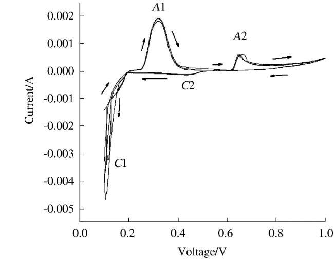 掃描速度:0.8 mV/s;循環(huán)周期:3 weeks圖1銀粉末微電極的循環(huán)伏安曲線