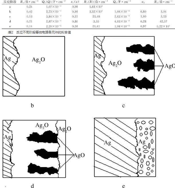 反應(yīng)不同階段等效電路各元件的擬合值如表2,表中只列出了溶液和電極層的電阻和電容。在反應(yīng)的各階段,溶液的電阻基本不變并且都較小。反應(yīng)前(a階段),銀粉末電極形成一層表面光滑(n=0.98)、內(nèi)部致密(電容小、孔隙率低)的電極層。當(dāng)Ag2O生成后(b階段),電極外層的電容增加(1.07×10-3F·cm-2→2.73×10-3F·cm-2),這可能是由于氧化過程需要OH-參與,其向電極層內(nèi)部進(jìn)行滲透,形成離子通道。水和OH-的進(jìn)入,使電極外層的介電常數(shù)增大,電容升高。外層電阻受兩方面因素的影響,一方面Ag2O的生成使電阻增加;另一方面,外層中堿液的進(jìn)入,使得電阻減小,而后者占了上風(fēng),所以外層電阻減小(5.81×104Ω·cm-2→3.32×104Ω·cm-2)。而電極內(nèi)層的電容和電阻都較小,這是由內(nèi)層未氧化的銀形成的。b階段形成的銀電極的結(jié)構(gòu)見圖4b。