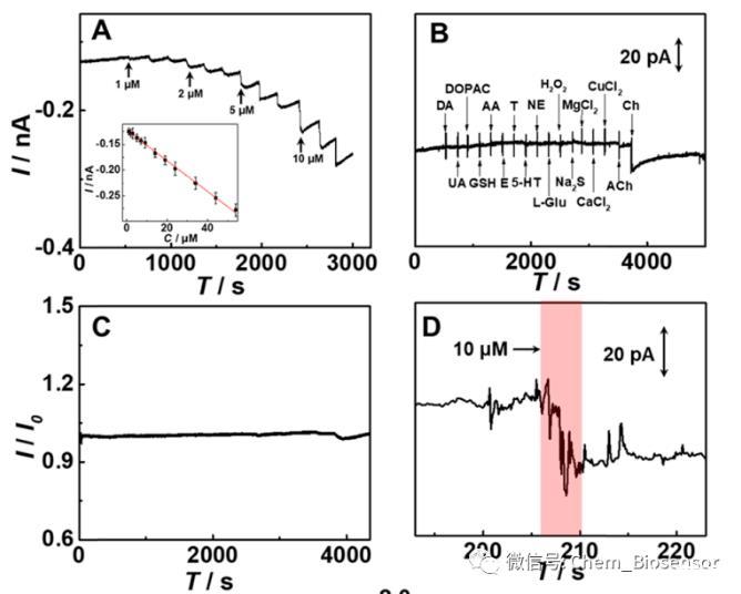 圖2.在不同條件下在aCSF中的LLIM獲得的電流響應:(A)在連續添加不同濃度的Ch后電流變化。插圖電流響應與Ch濃度線性關系;微電極的選擇性(B)、穩定性和對10μM Ch的響應。