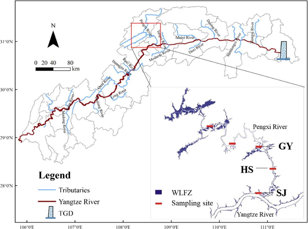 圖1、三峽大壩區(qū)域及本實(shí)驗(yàn)中詳細(xì)研究地點(diǎn)的地圖。