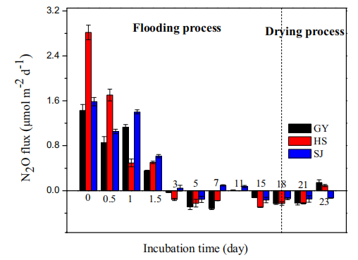 通過完整的沉積物芯樣培養(yǎng)和瓶校準(zhǔn)靜態(tài)頂空氣相方法,研究了三峽大壩WLFZs的典型洪水-干燥過程中N2O的產(chǎn)生和排放。結(jié)果顯示在洪水階段的前1.5天存在N2O源-匯轉(zhuǎn)換。盡管與其他內(nèi)陸水體相比,N2O的排放通量相對較小,但由于整個三峽大壩區(qū)域WLFZs的極大規(guī)模,總量應(yīng)予以考慮。洪水初期的N2O突發(fā)排放也應(yīng)在未來的水庫操作中加以考慮,以發(fā)揮其減緩潛力。