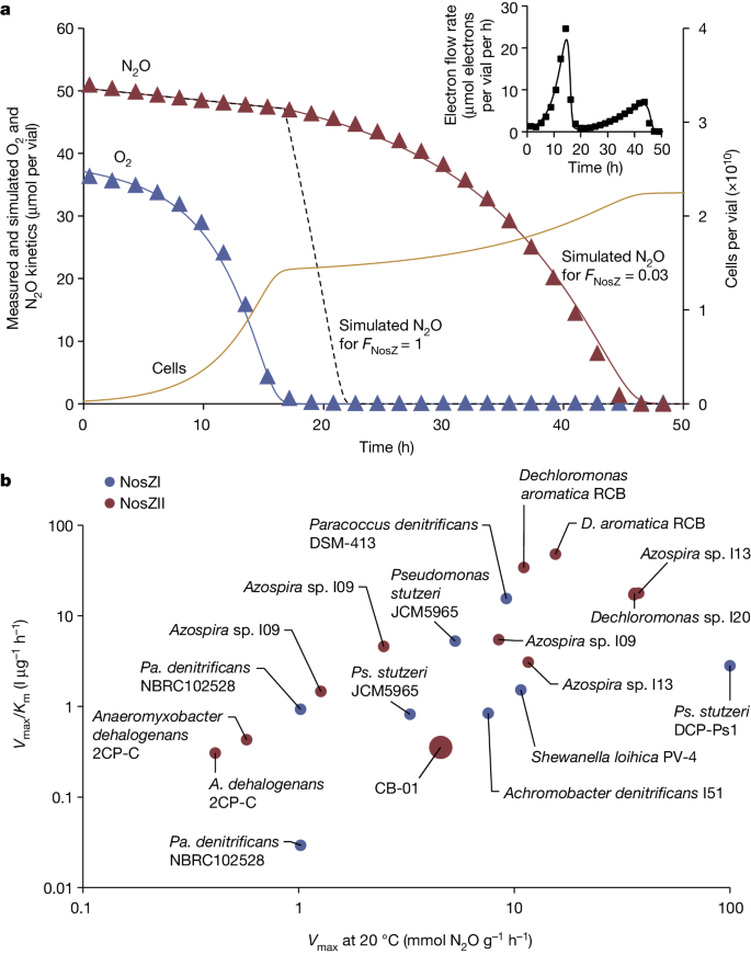圖1N2O還原的生物動力學,CB-01與其他菌株的比較。