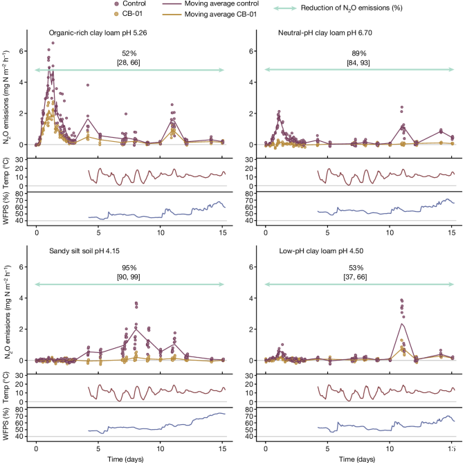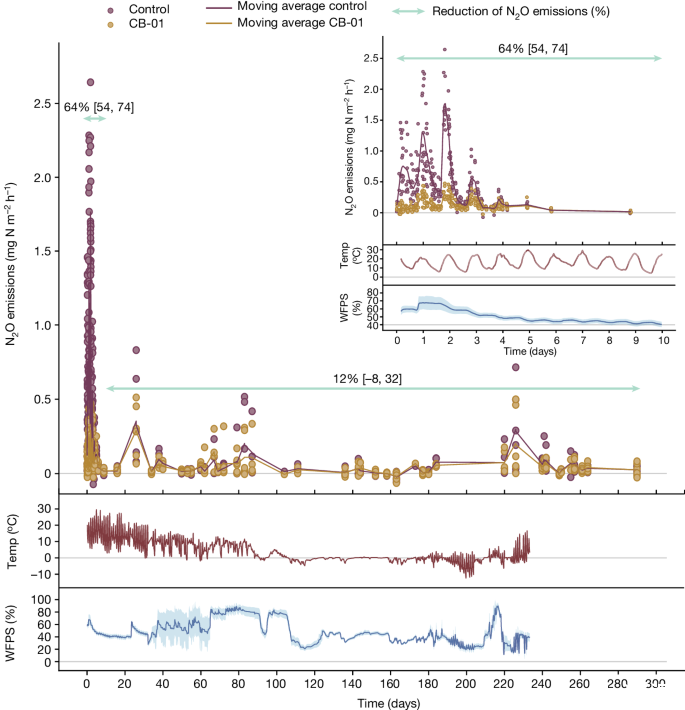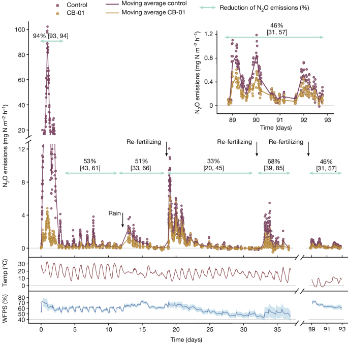 在實驗室條件下,CB-01菌株在無氧條件下可以將N2O還原為N2,但其生物動力學參數(如Vmax為0.11 h?1,Km為12.9μM N2O)與其他N2O呼吸細菌相比并不優越。在田間實驗中,使用CB-01菌株處理的土壤,通過施用生物沼氣生產過程中產生的廢渣,能夠將N2O排放量減少50-95%,具體效果取決于土壤類型。CB-01菌株在土壤中的持久性和對N2O排放的長期影響與其在土壤中的穩定性有關,而不是其生物動力學參數,同時CB-01的添加對土壤微生物群落的結構和多樣性沒有負面影響。在歐洲使用CB-01技術預計可以減少5-20%的人為N2O排放,如果包括其他有機廢料,減排潛力可能更大。