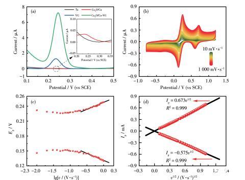 圖3(a)四種微電極對10μmol·L-1尿酸的DPV曲線(插圖:Ta和Cu2O/Cu微電極響應曲線局部放大圖);Cu2O/Cu‐VG微電極的(b)以10~1 000 mV·s-1的掃描速率記錄的CV曲線、(c)峰電位和掃描速率對數的關系、(d)峰電流與掃描速率平方根的線性關系