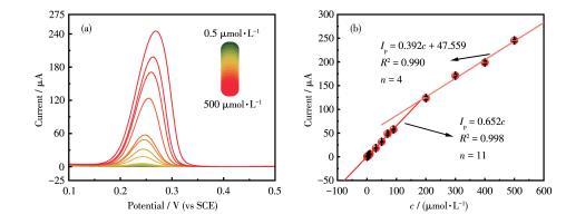 (1)圖7給出了在不同pH值環境中Cu2O/Cu‐VG微電極對尿酸響應的工作曲線及靈敏度。對于10~90μmol·L-1的尿酸,峰電流與尿酸濃度均呈線性關系。此外,在pH 6.0~8.0范圍內,隨著pH值的升高,尿酸的靈敏度先升高后降低,靈敏度變化范圍為0.428~0.797μA·L·μmol-1。這些結果證實了該Cu2O/Cu‐VG微電極適用于腦脊液、血液、尿液、腸液等不同pH值的體液環境。進一步模擬pH 7.4的體液環境,詳細考察了Cu2O/Cu‐VG微電極對尿酸的定量檢測能力。圖8a展示了使用該微電極在0.5~500μmol·L-1的濃度范圍內記錄的DPV曲線,而圖8b給出了工作曲線。