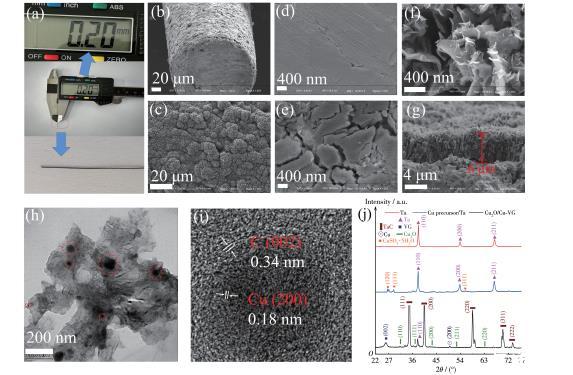 圖1 Cu2O/Cu‐VG微電極的(a)光學照片及(b、c)表面SEM圖;(d)Ta微絲、(e)Cu前驅體/Ta微絲及(f)Cu2O/Cu‐VG微電極的高倍表面SEM圖;Cu2O/Cu‐VG微電極的(g)截面SEM及(h、i)TEM圖;(j)3個微電極的XRD圖