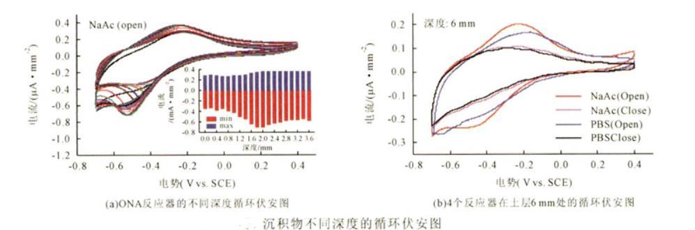 循環伏安(CV)結果顯示(圖3),在ONA反應器中,隨著深度的增加,Fe*的還原峰值先是增加,在約20mm處增加到最大,然后緩慢下降。氧化峰是逐漸增加的,其變化不明顯。原因分析,由于天然微生物燃料電池效應,使得1.5~2.0mm處的微生物活性更高,從而產生更多的Fe離子,而深層Fe*還原峰值下降是因為,距離上層溶解氧較遠,傳輸電子速率下降,因而影響了微生物的活性。這與pH、O2微電極結果的實質是一致的。這也進一步說明土柱的中間層變黑(圖1)的原因,即Fe*在厭氧區擴散,與硫化氫發生反應,產生FeS沉淀。Risgaard-Petersen等研究表明,土層中的游離Fe主要來自FeS的溶解,其溶解率為(5.9±0.7)mmol/(m2·d)(以Fe計)。當Fe*在厭氧區擴散,與硫化氫發生反應,即產生FeS沉淀;當Fe*往好氧區擴散,與O,發生反應,產生Fe(OH)沉淀。本實驗結果,在ONA反應器的液面上也發現少量的黃色物質(圖中未顯示),推測是Fe(OH)沉淀。