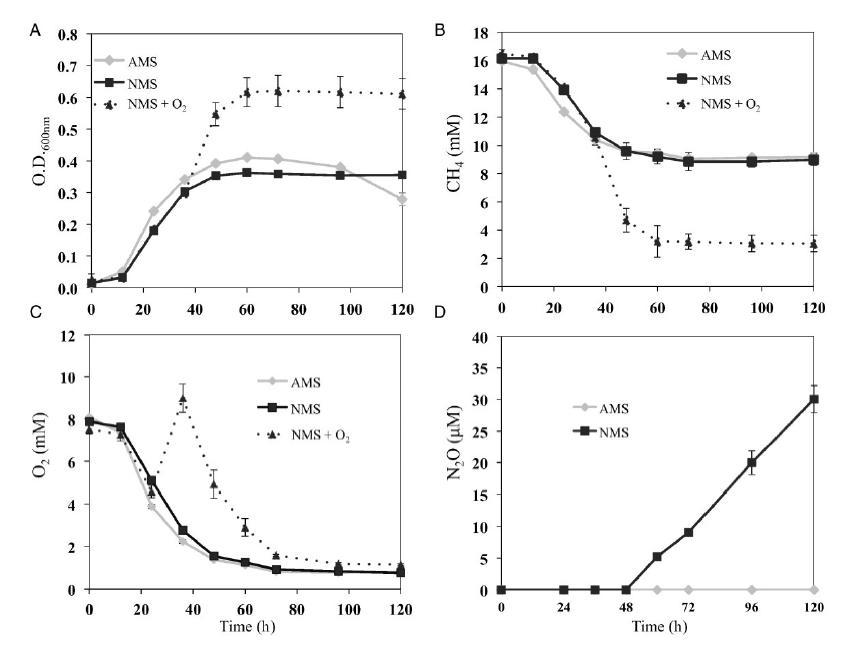 圖1、Methylomonas denitrificans sp.nov.株FJG1T在AMS和NMS培養基中培養時的生長、甲烷和氧氣消耗以及一氧化二氮產生。M.denitrificans sp.nov.株FJG1T在封閉的玻璃瓶中以100 ml的AMS或NMS培養基培養120小時,瓶蓋為丁基橡膠隔膜帽,氣體頭空間的混合比例為3:7,甲烷對氧氣。使用平板閱讀器在600 nm處測量光密度(A),并使用氣相色譜-熱導檢測器(GC-TCD)測量氣體頭空間中的甲烷(B)、氧氣(C)和一氧化二氮(D)濃度。所有數據點表示n=6的平均值±標準差。
