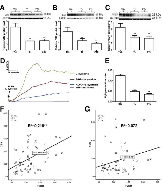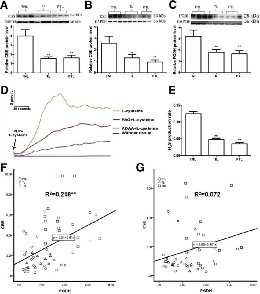 圖2、足月(TL)、非足月(TNL)和早產(PTL)絨毛組織中γ-半胱氨酸合成酶(CSE)和β-半胱氨酸合成酶(CBS)的表達、硫化氫產生率以及15-羥基前列腺素脫氫酶(PGDH)與CSE或CBS的相關性。絨毛組織取自TNL(24人)、TL(24人)或PTL(21人)時的單胎妊娠婦女。圖2A-C:TNL、TL和PTL絨毛膜組織中CSE(A)、CBS(B)和PGDH(C)的蛋白表達。有代表性的蛋白條帶顯示在相應直方圖的頂部。D:絨毛組織勻漿中硫化氫產生的代表性痕跡。E:TNL、TL和PTL絨毛膜組織的硫化氫產生率。F和G:絨毛組織中PGDH與CSE或CBS的相關性。