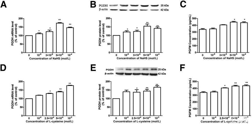 圖3、硫化氫對培養的絨毛滋養層細胞中15-羥基前列腺素脫氫酶(PGDH)表達和活性的影響。A-C:NaHS對PGDH mRNA(A)和蛋白(B)表達以及活性(C)的影響。用濃度不斷增加的NaHS(10-5至10-4mol/L)處理細胞24小時。D-F:L-半胱氨酸對絨毛膜細胞中PGDH mRNA(D)、蛋白(E)和活性(F)表達的影響。用濃度不斷增加的L-半胱氨酸(10-4至10-3mol/L)處理細胞24小時。G-I:DL-丙炔基甘氨酸(PAG)和氨基氧乙酸半鹽酸鹽(AOAA)對L-半胱氨酸刺激PGDH mRNA(G)和蛋白(H)表達及活性(I)的影響。在PAG和AOAA存在或不存在的情況下,用L-半胱氨酸(10-3mol/L)處理細胞24小時。J-L:β-半胱氨酸合成酶(CBS)和γ-半胱氨酸合成酶(CSE)在L-半胱氨酸刺激PGDH表達中的作用。用CSE siRNA、CBS siRNA或干擾siRNA轉染細胞,然后用10-3mol/L L-半胱氨酸處理24小時。轉染CSE siRNA(J)和CBS siRNA(K)的細胞中CBS和CSE的代表性表達。L-半胱氨酸對轉染CSE siRNA和CBS siRNA細胞中PGDH表達的影響(L)。PGDH mRNA和蛋白的表達及活性分別通過實時RT-PCR、Western印跡分析和轉化檢測進行測定。