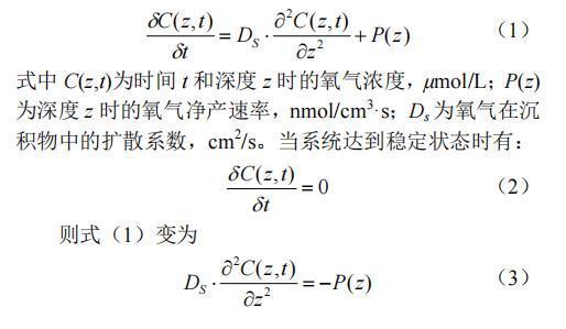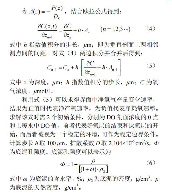 Jan等結(jié)合微電極建立了Profile模型,引入了氧氣凈產(chǎn)量的概念,即光合作用、呼吸作用以及擴(kuò)散作用綜合的結(jié)果,來反映界面中有氧微生物的生命活動(dòng)強(qiáng)弱。模型可以分辨水中汽泡、生物活動(dòng)等偶然因素引起的異常數(shù)據(jù),精確體現(xiàn)剖面結(jié)構(gòu),應(yīng)用實(shí)測(cè)剖面溶質(zhì)濃度數(shù)據(jù)和底泥孔隙度等作為邊界條件進(jìn)行分層優(yōu)化擬合計(jì)算得出每層的單位體積耗氧速率。對(duì)于DO剖面圖來講底部氧氣已耗盡,一般都是以一個(gè)恒定的濃度值0作為結(jié)束終點(diǎn),即在剖面圖底部存在一個(gè)0濃度和0通量;而在H2S剖面的最頂部上方的一個(gè)區(qū)間里濃度值為0值,通量也為0通量,該模型主要基于Fick擴(kuò)散第二定律