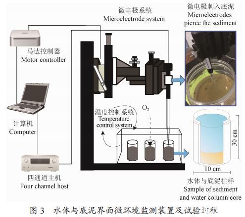 本試驗(yàn)采用丹麥微電極(MM-METER,Unisense)系統(tǒng)在實(shí)驗(yàn)室進(jìn)行農(nóng)田排水溝水體與底泥DO和H2S濃度剖面測(cè)量。該系統(tǒng)主要由微電極、四通道主機(jī)、馬達(dá)控制器、微電極推進(jìn)器、Sensor Trace PRO軟件、實(shí)驗(yàn)室支架LS18等組成(圖3)。