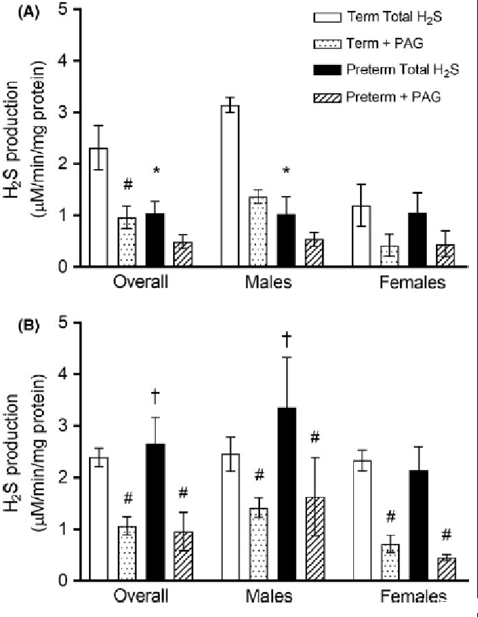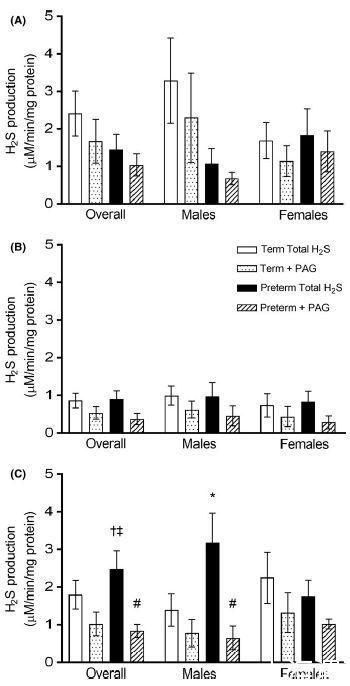 圖4、收集自胎兒(圖A;足月雄性,n=4;足月雌性,n=3;早產雄性,n=4;早產雌性,n=4)和產后24小時的新生兒(圖B;足月雄性,n=4;足月雌性,n=3;早產雄性,n=3;早產雌性,n=4)的心臟能夠產生硫化氫,當提供過量的底物和輔因子時。添加丙炔氨酸(PAG)表明,在產后心臟中,總硫化氫的一個顯著比例是通過依賴CSE的機制產生的。*P<0.05與同一性別的相應足月組比較,?P<0.05與胎兒時間點內的相應胎齡組比較,#P=0.05與相應的總硫化氫產生值比較。