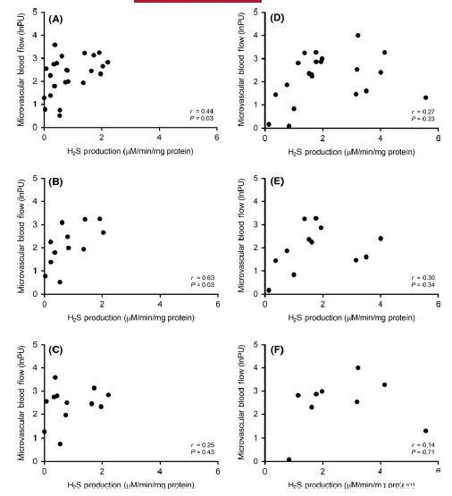 圖3、在產后10小時(A-C)和24小時(D-F)微血管血流與總血管硫化氫產生能力的關聯。在所有新生兒(圖A;n=24)、足月新生兒(圖B;n=12)中觀察到正相關,但在早產新生兒(圖C;n=12)中未觀察到。在產后24小時,無論是總體(圖D,n=22)還是足月(圖E;n=12)或早產(圖F;n=10)新生兒,微血管血流與總血管硫化氫產生能力之間均未觀察到關聯。
