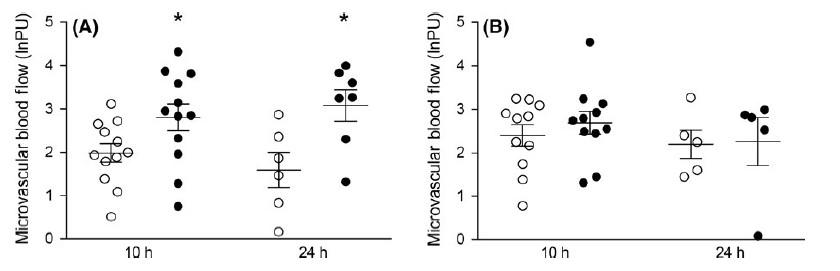 圖1、(A)雄性和(B)雌性豚鼠新生兒的微血管血流。使用激光多普勒流量測量在頸部的皮下微血管血流,以自然對數單位表示(lnPU),在產后10小時和24小時對足月(開放圓圈)和早產(實心圓圈)豚鼠新生兒進行測量。24小時組的動物在產后10小時和24小時都進行了微血管評估。A,與足月雄性相比,早產雄性在產后10小時(足月,n=12;早產,n=12)和24小時(足月,n=6;早產,n=7)的微血管血流顯著更高。B,胎齡對雌性在產后10小時(足月,n=11;早產,n=11)或24小時(足月,n=5;早產,n=5)的微血管血流沒有影響。*P<0.05與同一性別的相應足月組比較。