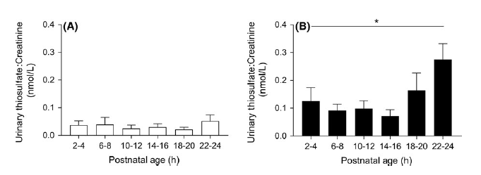 圖5、在產后24小時內,通過測量尿中的硫代硫酸鹽來評估足月(圖A;n=11)和早產(圖B;n=12)豚鼠的系統總硫化氫產生。在整個24小時期間,尿中的硫代硫酸鹽在早產兒中顯著高于足月兒(P=0.002)。在早產組中,隨著產后年齡的增長,系統總硫化氫產生增加(*P=0.003),在足月兒中未觀察到這種關系。