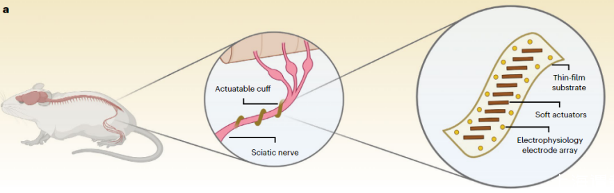 圖2:軟執行器集成神經袖帶電極和柔性神經套囊主動包裹坐骨神經以實現無需縫合的親密界面的概念示意圖。