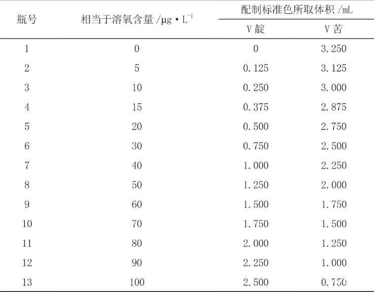 較為直觀的內電解法確實有一定的優(yōu)勢,在pH為9的介質中,靛藍二磺酸鈉被多孔銀粒與鋅粒組成的原電池電解,形成還原型黃色物質,當與水中溶解氧相遇又被氧化成氧化型藍色物質,色澤深淺與水中溶解氧含量有關,可以用比色法測定水中溶解氧含量。鍋爐給水和凝結水中常見的離子均不干擾溶解氧的測定。這種直接反應生產(chǎn)的顏色判斷,可以直接對比出水中溶解氧的含量大小,一目了然。但是其一直也存在較為明顯的缺點,如需要制備較為容易失效的靛藍二磺酸鈉溶液、銀-鋅還原劑等,且制備溶液過程中需要標定,分析過程中涉及試劑及操作均比較繁瑣,比色時由于標準溶解氧不易獲得,實驗中配制溶解氧標準色是按照“假色原理”配制的。即依照假定還原型靛藍二磺酸鈉(黃色)與溶解氧完全反應生成氧化型靛藍二磺酸鈉(藍色)的數(shù)量加入酸性靛藍二磺酸鈉,未反應的還原型靛藍二磺酸鈉(黃色)用相應苦味酸代替來配制溶解氧標準色[4-5],具體見表1。