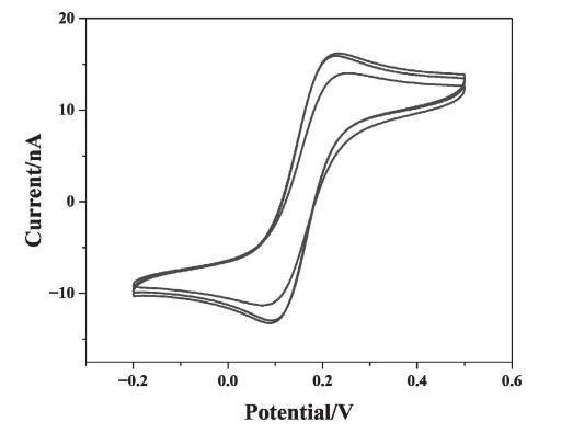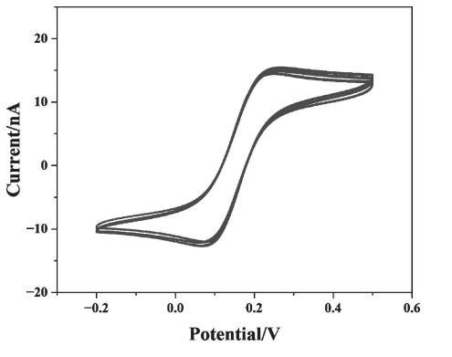 步驟5、將步驟4制得的表面可更新的金微電極用粒徑為0.05μm的氧化鋁粉拋光,并在去離子水沖洗后,置于含有0.1mol/L KCl支持電解質的1mmol/LK3Fe(CN)6/K4Fe(CN)6(1:1)氧化還原標準溶液中,采用以拋光后的表面可更新的貴金屬微盤電極為工作電極、以鉑絲為對電極和以Ag/AgCl(飽和KCl)為參比電極組成的三電極體系,在-0.2~0.5V電位窗口,以100mV/s的掃描速率進行循環伏安(CV)掃描處理,連續掃描5圈,記錄該表面可更新的貴金屬微盤電極的CV曲線。