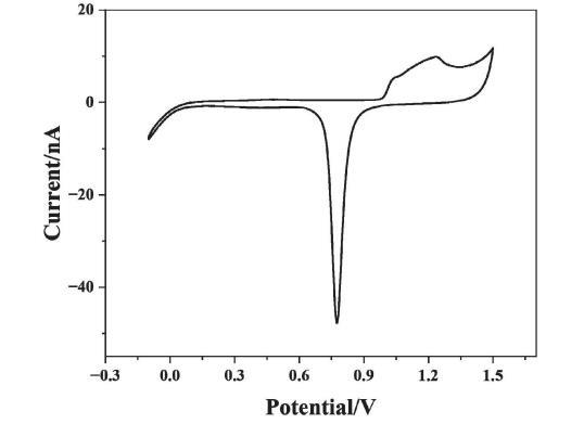圖2,表面可更新的金微盤電極置于0.1mol/L的H2SO4水溶液中,采用以制得的表面可更新的金微盤電極為工作電極、以鉑絲為對電極和以Ag/AgCl(飽和KCl)為參比電極組成的三電極體系,在-0.1~1.5V電位窗口,以100mV/s的掃描速率進行CV掃描處理至CV曲線穩定,記錄該表面可更新的金微盤電極的CV曲線。
