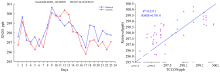 驗證結果如圖1所示,衛星遙感與地面觀測結果一致性較好,相關系數r為0.73,驗證樣本數為7月—9月內的23個有效值。