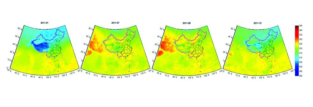 2011年我國氧化亞氮濃度的季節均值變化:氧化亞氮濃度在夏季(6月—8月)達到最高值,春、秋季次之,冬季最低。氧化亞氮的人為排放源主要來自于農業排放,其他一些較小的排放源來自工業、城市垃圾和化石燃料燃燒等。而我國為了用僅占全球7%的耕地,養活占全球22%的人口,近年來積極推進農業集約化規模化發展,這也導致了對氮肥的大量使用,增加了氧化亞氮的排放量。從反演結果來看,氧化亞氮的高值區分布和我國的農業集約化發展情況一致,尤其在西北地區、西南地區和南部地區,在夏季氧化亞氮濃度急劇升高。