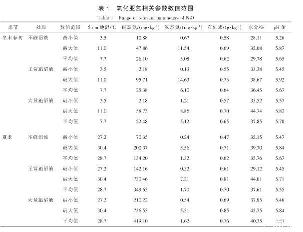 表1為冬末春初和夏季氧化亞氮相關參數的數值范圍,包括5 cm地度、硝態氮、有機碳、土壤水分、氨態氮以及土壤pH值的最大值、最小值以及平均值。其中,硝態氮、氨態氮及有機碳的數值基本上隨著施沼液量的增加而增加; 土壤水分含量基本為30%~40%;土壤pH 6.0以下,呈酸性。
