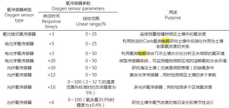 表1歸納對比了典型土壤氧傳感器的類型和適用范圍。氧化鋯氧傳感器具有較高的測量精度,響應速度較快,能夠迅速反映氧氣濃度的變化,但使用時必須加熱,而高溫會影響土壤氧環(huán)境,對測量結(jié)果產(chǎn)生較大影響,因此在土壤氧氣檢測領域應用較少。電化學氧傳感器原理簡單、精度高,但檢測過程中存在消耗氧氣和電極材料等問題,無法長期原位監(jiān)測,檢測結(jié)果不穩(wěn)定、重復性較差的問題,這與傳感器的腔室、電極和透氧膜的制作有關。光纖氧傳感器不需要消耗氧分子,也無需對樣品進行任何處理,可實現(xiàn)長期原位監(jiān)測,在氧氣檢測領域具有很好的發(fā)展趨勢。但需要精密的光學儀器,且氧傳感膜的制作工藝困難,成本較高。