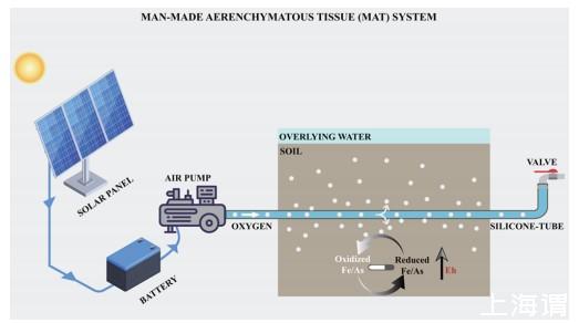 圖1、人造通氣組織(MAT)系統示意圖。該圖說明了將空氣泵入MAT中使用的硅膠管的過程。垂直土壤剖面說明了MAT的潛在工作機制。