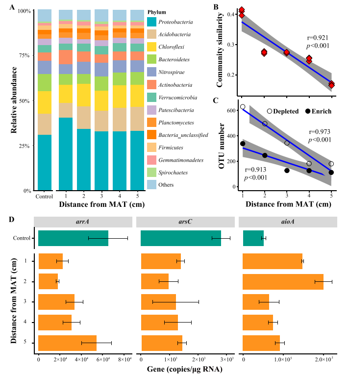 圖5、微生物群落組成和As代謝基因豐度的變化。(A)微生物群落在對照中的分布以及與MAT表面不同距離處的分布;(B)距MAT表面不同距離處的群落相似性;(C)在距MAT表面不同距離處OTU數量顯著變化;(D)作為對照的代謝基因,與MAT表面相距不同的距離。