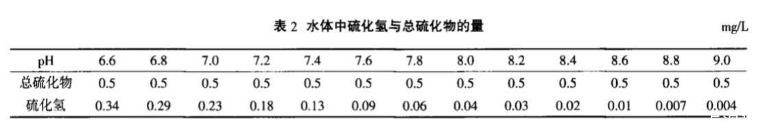 從表2中可以看出H2S、HS-、S2-與pH之間有直接的關系:當pH值為9時,總硫化物中約1%為硫化氫;當pH值為7時,總硫化物中約50%為硫化氫。在池塘底部或底泥中,隨著有機質的分解,pH值普遍偏低。