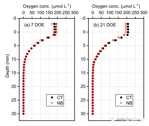 在每種情況下,兩種水類型的土壤氧協(xié)調(diào)作用都從0到1 mm深度急劇下降(圖3)。在7和21 DOE處達(dá)到20毫米深度,在35和49 DOE處達(dá)到25毫米深度之前,氧濃度降低到檢測極限以下(即0.3μmolL-1)。氧氣耗竭的程度隨時間而降低。另外,地表水中的氧氣濃度(即,<0mm深度)隨時間逐漸增加。在7和21 DOE上未觀察到水類型對氧氣濃度的影響;然而,最終在35 DOE上觀察到了這種影響,這種趨勢一直持續(xù)到49 DOE。在35 DOE上,在5–7和12–13 mm深度處觀察到水類型之間的氧濃度存在顯著差異,在4、8–11和14–15 mm深度處觀察到邊際差異(p<0.1)。