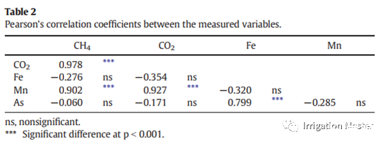 總CH4排放量,總CO2排放量和淋溶Mn總量之間存在顯著正相關(guān)(表2)。與我們的預(yù)期相反,淋溶鐵的總量與淋溶砷的總量僅具有顯著的正相關(guān)。