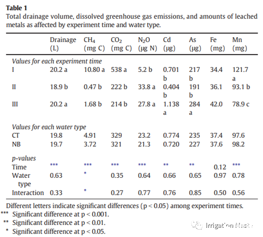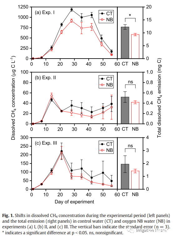 總CH4排放量受實驗時間和水類型的影響很大,并且存在顯著的相互作用(表1)。在每種類型水中,實驗時間的影響也很明顯。這種相互作用歸因于水類型不同對實驗時間的不同響應(yīng)。也就是說,僅在最大排放量的實驗I中觀察到由于使用含氧納米氣泡水而導(dǎo)致的CH4排放顯著下降(降低了24%),而在實驗II中觀察到了這種趨勢(降低了20%)。III(減少28%),排放量較小(圖1)。