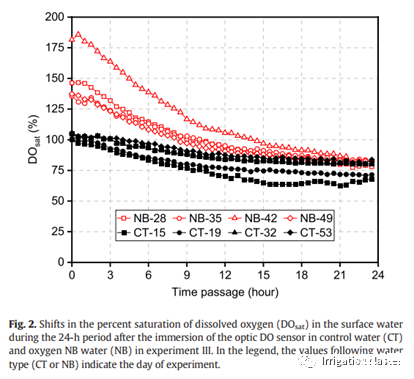 對照水中的DOsat(DO的飽和度百分比)隨時間逐漸降低,并在每次測量15小時后達(dá)到最小值(圖2)。在對照水中,有四次收斂的DOsat水平隨時間增加。在含氧納米氣泡水中,DOsat在8.5-14.5 h內(nèi)降至飽和水平(即100%),并在24 h內(nèi)收斂至約80%。含氧納米氣泡水的初始DOsat通常不高(DO=11.5–15.2 mg L-1),部分原因是納米氣泡生成后2小時內(nèi)暴露于空氣中。