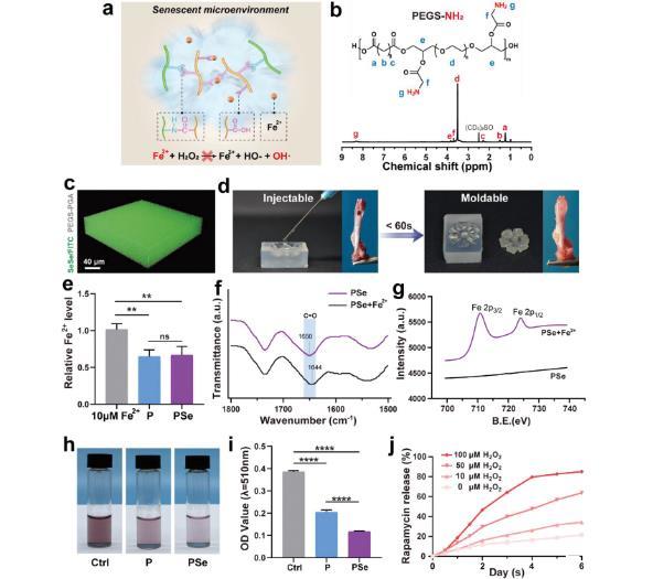 圖2、負載SeR納米膠束(PSeR)的可注射PEGS-PGA水凝膠的制備和表征。a)PEGS-PGA通過羧基調節衰老微環境的示意圖。b)PEGS-NH 2的1 H NMR分析。c)均勻分散在PEGS-PGA中的SeSe/FITC膠束的熒光圖像。d)可注射PSe水凝膠的照片,該水凝膠具有對復雜輪廓的形狀適應性和對骨缺損的粘附力。成型時間小于60秒。e)P和PSe水凝膠在10μm FeSO 4溶液中對Fe 2+的螯合能力。g)P和Pse水凝膠的FT-IR光譜。f)Fe2p3/2和Fe2p1/2峰的XPS譜。h)P和PSe水凝膠對·OH清除的影響。SA與Fe2+和H 2 O 2反應用作對照。i)通過510 nm處的特征吸光度測量羥基自由基的相對殘留量。j)Rapa在不同濃度的H2O2下從PSeR水凝膠中的累積釋放曲線。