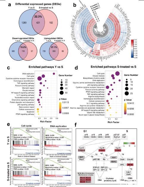 圖5、PSeR治療減弱衰老BMSC中年齡相關通路的表達。a)維恩圖,顯示Y與S以及S處理與S處理的BMSC的DEG。b)熱圖,代表Y與S處理與S處理的前100個顯著基因表達值。c)Y與S顯著差異表達基因(DEG)的代表性KEGG通路(p≤0.05,|log倍數變化|≥1)。d)S處理與S處理顯著不同的表達基因的代表性KEGG通路(p≤0.05,|log倍數變化|≥1)。e)Y與S以及S處理與S的MSC的GSEA圖(|NES|>1,標稱p值<0.05,FDR<0.25)。f)示意圖總結了S處理與S處理的DEG與G1到S過渡期間細胞周期調節相關的DEG,通過KEGG通路聚類進行分析。