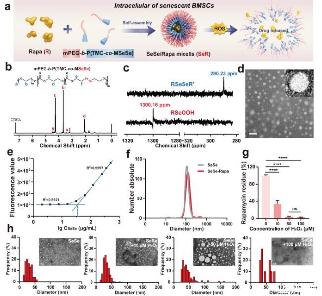 圖1、具有ROS清除能力的SeR納米膠束的制備和表征。a)mPEG-b-P(TMC-co-MSeSe)和SeR納米膠束的合成路線。b)mPEG-b-P(TMC-co-MSeSe)的1 H NMR分析。c)mPEG-b-P(TMC-co-MSeSe)和100μm H 2 O 2氧化的mPEG-b-P(TMC-co-MSeSe)的77 Se NMR分析,氧化后,峰位置從290.23至1300.16 ppm。d)PBS中SeSe納米膠束的代表性透射電子顯微鏡(TEM)圖像,插圖是單個納米膠束的高強度圖像。比例尺:100 nm。e)使用TMA-DPH作為熒光探針檢測SeSe納米膠束的臨界膠束濃度(CMC)。對應于交點的橫坐標表示lg CMC。f)通過納米顆粒跟蹤分析儀器(NTA)測量的SeSe納米膠束的尺寸分布。g)SeSe膠束在不同濃度的H 2 O 2反應15分鐘后的Rapa釋放率,當受到50和100μm的H2O2濃度時,超過98%的R釋放。h)SeSe膠束在含有不同濃度H2O2的PBS中的形態和粒徑頻率的TEM圖像。SeSe膠束的大小與H2O2濃度相關并且在100μmH2O2中破裂。