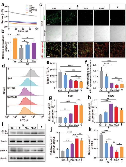圖3、PSeR水凝膠調節衰老BMSCs的細胞內和細胞外ROS水平,并提高衰老BMSCs的體外抗氧化能力。a)微電極監測動物血清氧化還原電位。b)HORAC熒光素探針檢測動物血清的抗氧化能力。c)DCFH-DA熒光染色和JC-1熒光染色檢測CM誘導的BMSC。比例尺:200μm。d,e)流式細胞術檢測BMSCs的DCFH-DA熒光強度。f)使用JC-1試劑通過熒光共聚焦和定量分析檢測線粒體膜電位。比例尺:100μm.g,h)Sirt1和Sod2的定量實時聚合酶鏈反應(qRT-PCR)分析。i,j)經水凝膠處理后BMSC中LC3B蛋白的表達。i,k)水凝膠處理后BMSC中γH2A.X蛋白的表達。