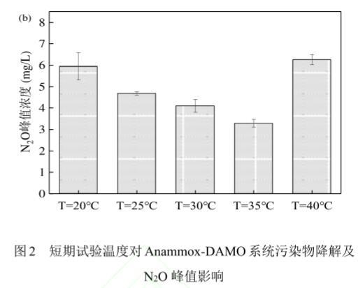 圖2短期試驗溫度對Anammox-DAMO系統污染物降解及N2O峰值影響