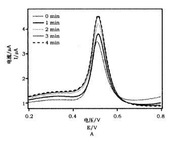 圖2(A)石墨烯修飾電極浸入碘溶液中不同時間的方波伏安圖;(B)氧化峰電流隨電極浸泡時間的變化圖