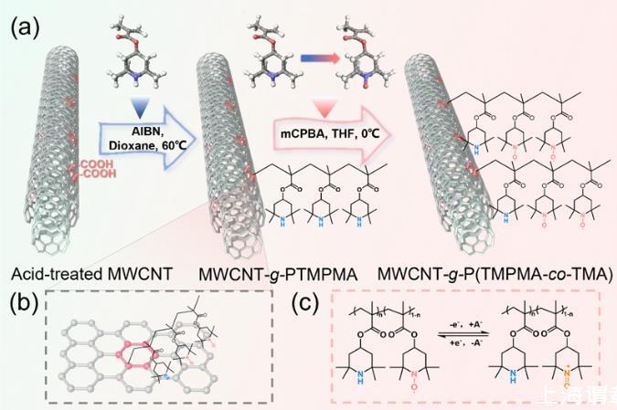 首先,通過典型的自由基聚合法(SI-ATRP),在羧基化的多壁碳納米管(MWCNT)表面接枝胺功能化聚合物PTMPMA,生成MWCNT-g-PTMPMA。隨后,使用間氯過氧苯甲酸(mCPBA)用作氧化劑,將PTMPMA上的氨基(N-H)氧化為氮氧自由基(N-O?),生成的產物為P(TMPMA1-x-co-TMAx),其中氧化程度(x)與mCPBA的投加量呈正相關(見圖1a)。共聚物在MWCNT表面上的接枝狀態如圖1b所示。在電氣控制下,P(TMPMA-co-TMA)表面氮氧自由基(N-O?)和氨氧離子(N=O+)的轉化,對應著PFAS吸附中靜電作用力的變化,控制著PFAS的吸附與釋放(見圖1c)。