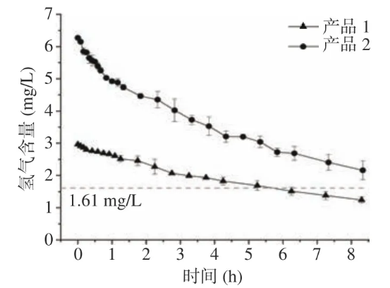 對市售7種罐裝富氫水(編號1~7),每種3個樣品(01~03),使用2種方法進行測試。結果見表3。可以看出,市面上罐裝富氫水氫氣含量均達到了團體標準T/NAHIEM 16-2019《含氫包裝飲用水》中規定的0.6 mg/L,但不同品牌產品氫氣含量相差很大,從0.8至6.2 mg/L不等。富氫水中的氫氣在暴露于空氣之中后易于散發,在產品開蓋后氫氣存留情況如何,也是一個值得關注的指標。本實驗以氫氣含量最高的產品(產品1和產品2)為代表,得到了在開蓋后富氫水氫氣含量隨時間變化情況。由圖4可知,在開始階段氫氣散失速度較快,之后逐漸減緩。對于初始濃度約為3 mg/L的富氫水產品,開蓋后5 h內仍然在氫氣水溶液飽和濃度之上;對于初始濃度約為6 mg/L的富氫水產品,開蓋后8 h內仍然可達到2.2 mg/L以上,遠超過飽和氫氣濃度。總體來說,開蓋后超飽和富氫水中氫氣存留量在30 min內降低約10%,6 h內約降低一半。