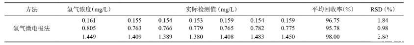 2.2.2準確度和精密度對氫氣濃度為0.1613、0.805、1.449 mg/L標準溶液使用氫氣微電極法進行檢測,平行測定6次。如表2所示,在0.161、0.805、1.449 mg/L添加水平,回收率分別為96.75%、95.78%和98.00%,說明準確度良好。相對標準偏差(RSD)分別為1.84%、0.98%和2.80%,均小于5%,說明精密度良好(表2)。