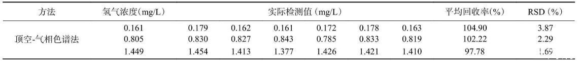 2.1.3準確度和精密度配制氫氣濃度為0.1613、0.805、1.449 mg/L的標準溶液進行檢測,每個濃度在優化后條件下平行測定6次,通過回收率來考察方法的準確度,通過相對標準偏差(RSD)來考察方法的精密度,測定結果如表1所示。實驗結果表明,在0.161、0.805、1.449 mg/L添加水平,回收率分別為104.90%、102.22%和97.78%,說明準確度良好。RSD分別為3.87%、2.29%和1.69%,均小于5%,說明精密度良好(表1)。