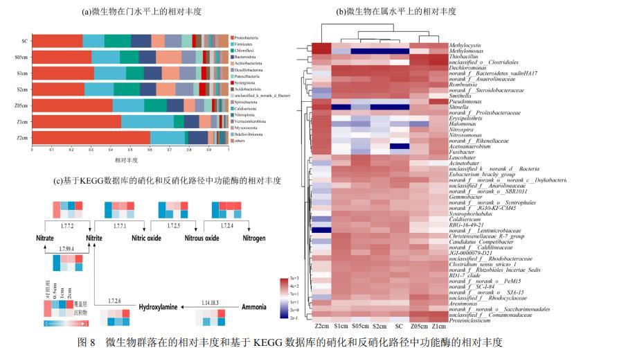 圖8微生物群落在的相對豐度和基于KEGG數(shù)據(jù)庫的硝化和反硝化路徑中功能酶的相對豐度