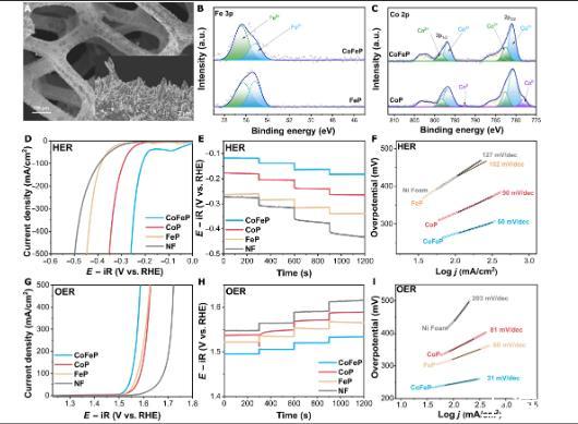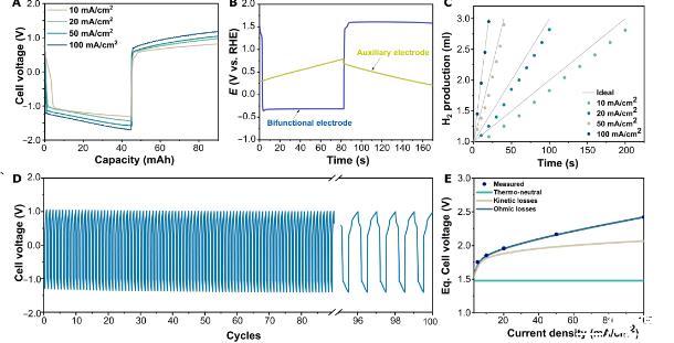 圖4、A)在1.0 M KOH中不同電流密度下單電池SCE水分解測(cè)試的電池電壓曲線。B)在50 mA/cm2的電流密度下進(jìn)行電解時(shí),雙功能電極和輔助電極的電極電勢(shì)。C)在電流密度從10到100 mA/cm2的范圍內(nèi)電解時(shí)的氣體產(chǎn)生情況。D)在5.0 M KOH中以20 mA/cm2的電流密度進(jìn)行20小時(shí)穩(wěn)定性測(cè)試的結(jié)果。圖4E:等效電池電壓不同貢獻(xiàn)的分解。