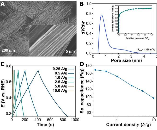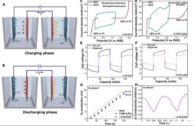 圖1、SCE設(shè)計(jì)和概念驗(yàn)證。(A)充電步驟和(B)放電步驟期間陽(yáng)極半電池和陰極半電池的擬議機(jī)制。在(C)1.0 M KOH和(D)0.5 M H 2 SO 4中以5 mV/s的掃描速率獲得ACC和Pt/C的伏安圖。考慮(E)1.0 M KOH和(F)0.5 M H 2 SO 4.中單電池和雙電池貢獻(xiàn)的電壓曲線(G)堿性和酸性介質(zhì)中的氫氣生成。(H)連續(xù)兩個(gè)循環(huán)的堿性儲(chǔ)層中的電導(dǎo)率。