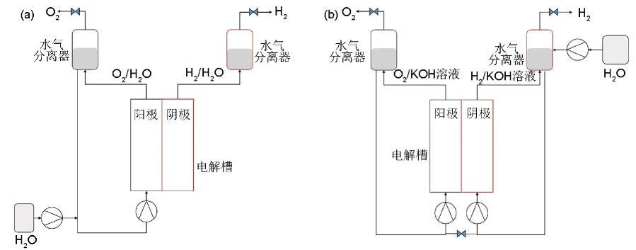 圖2(a)質子交換膜電解水系統和(b)堿性電解水系統示意圖